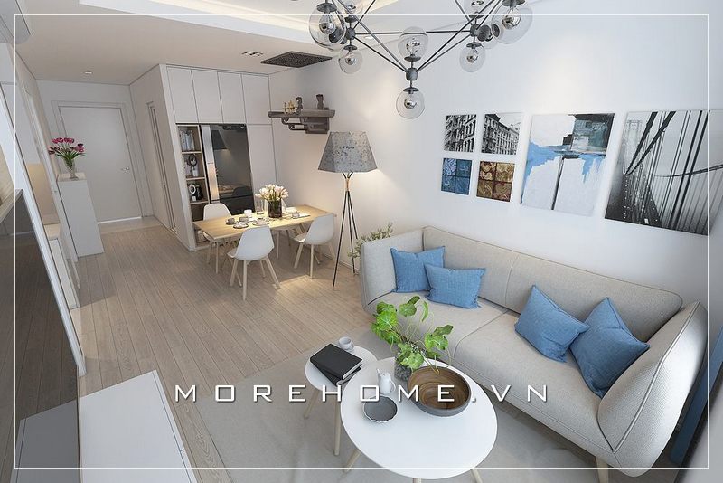 Phong cách hiện đại trẻ trung, đẹp độc đáo từ sắc trắng trong thiết kế nội thất phòng khách liền bếp căn hộ chung cư.