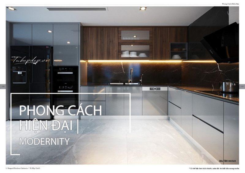 Hệ thống tủ bếp hình chữ L từ gỗ công nghiệp với thiết kế thời thượng được thiết kế để phù hợp với những gia chủ yêu thích phong cách trẻ trung và năng động.
