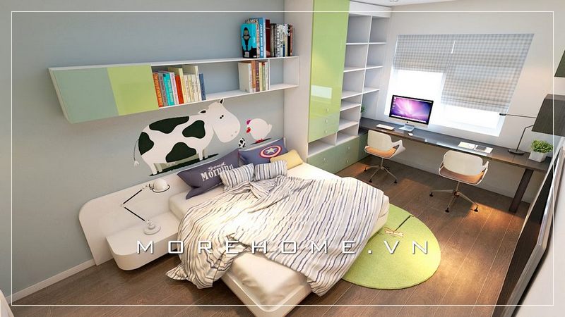 Nội thất phòng ngủ gỗ công nghiệp với gam màu tím lạ mắt tạo, tranh dán tường độc đáo cũng được gia chủ lựa chọn cho phòng ngủ bé gái